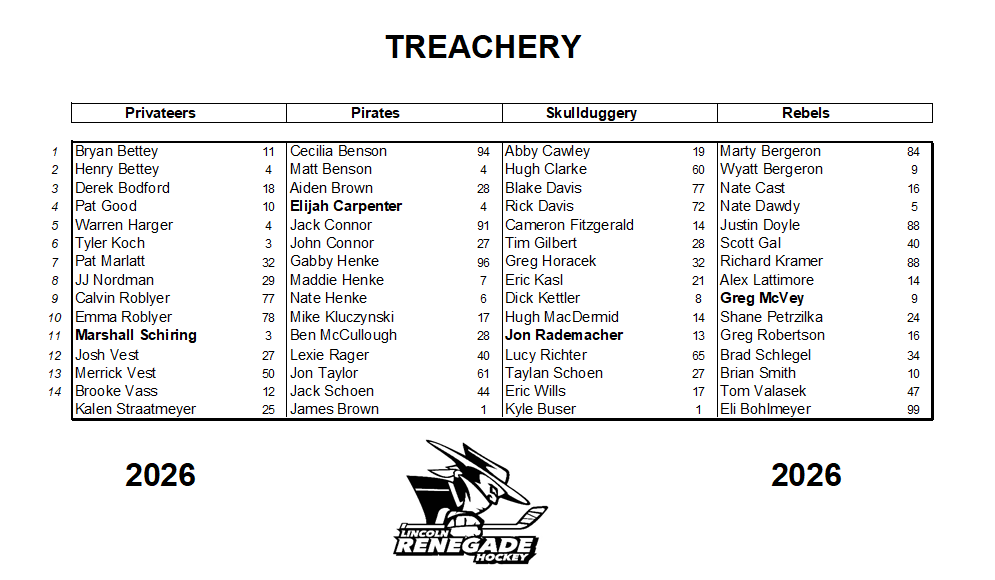 If you played last season, please double-check your jersey number below to make sure it's correct! If not, please email us so we get it corrected! If you played last year, we're assuming you still have both of your jerseys, and we're not planning to order more. However, if you don't have your sweaters from last season, email us right away at LincolnRenegadeHockey@hotmail.com.